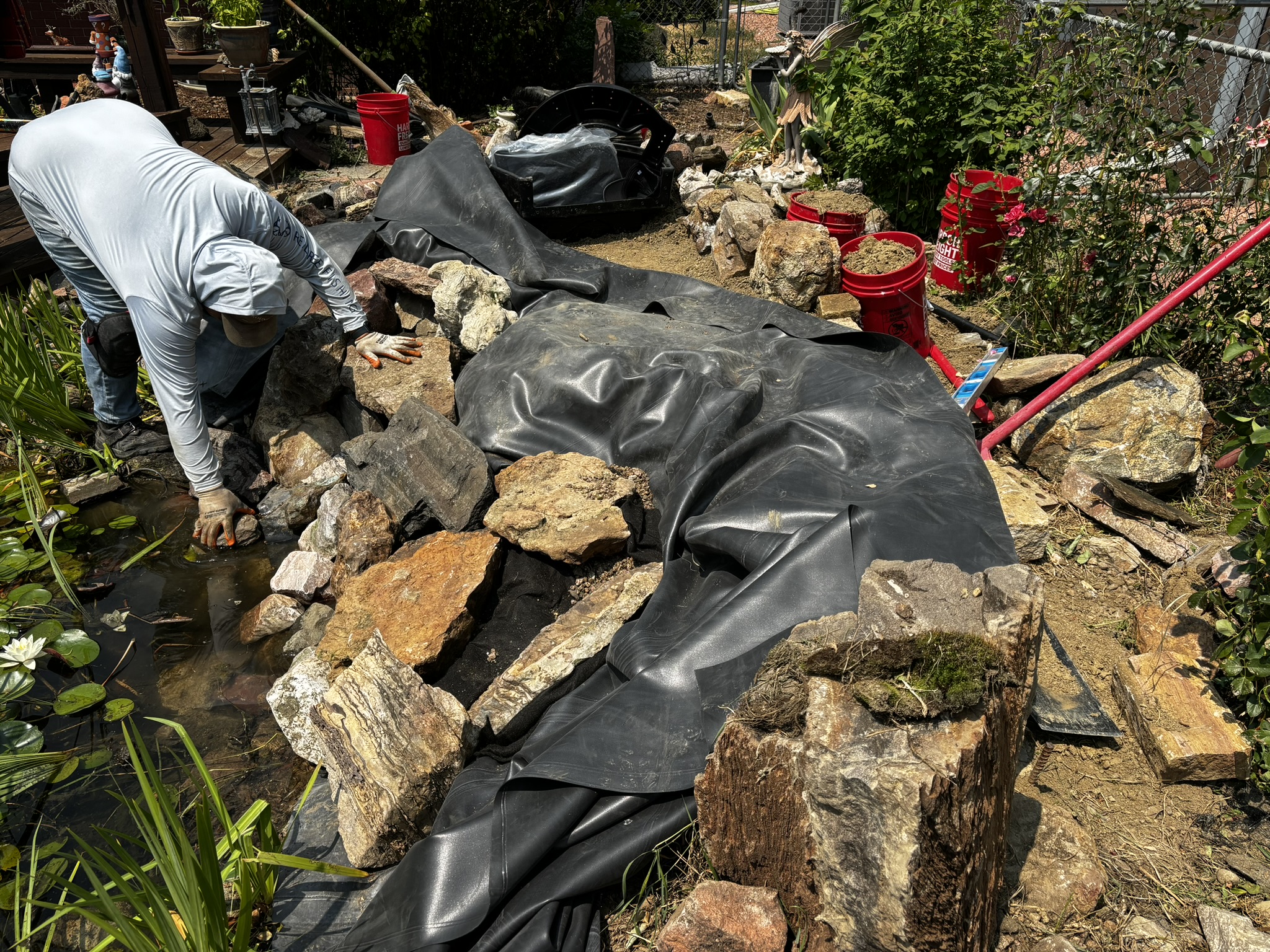 Properly edging a pond is essential to its longevity and appearance. During the edging process, there may be excess liner that needs to be trimmed. One of the most common and costly mistakes is cutting the liner too short. Over time, rocks and soil can settle, causing the edges to shift. If there isn’t enough liner left for adjustments, it becomes very difficult to fix these issues. Always ensure there’s extra liner left at the edges to allow for any necessary re-edging or adjustments in the future.