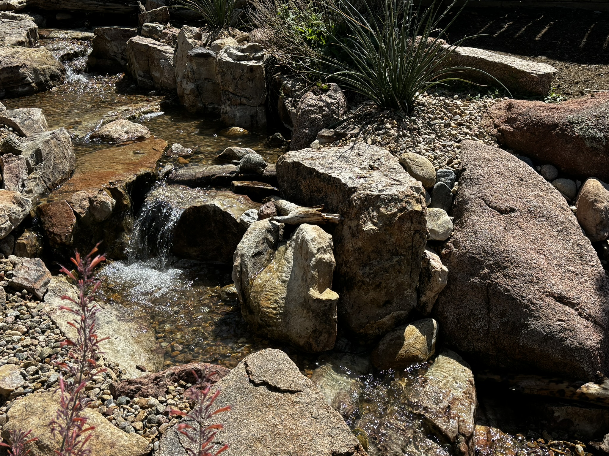 Starting at the top of the feature, we removed the gravel rock by rock and put it into a bucket with holes in it to rinse it. We also took a super fine mesh aquarium net and placed it just right, so that water washing down the waterfall would have to go through it and it could catch the miniscule pieces that could not be picked out by hand.