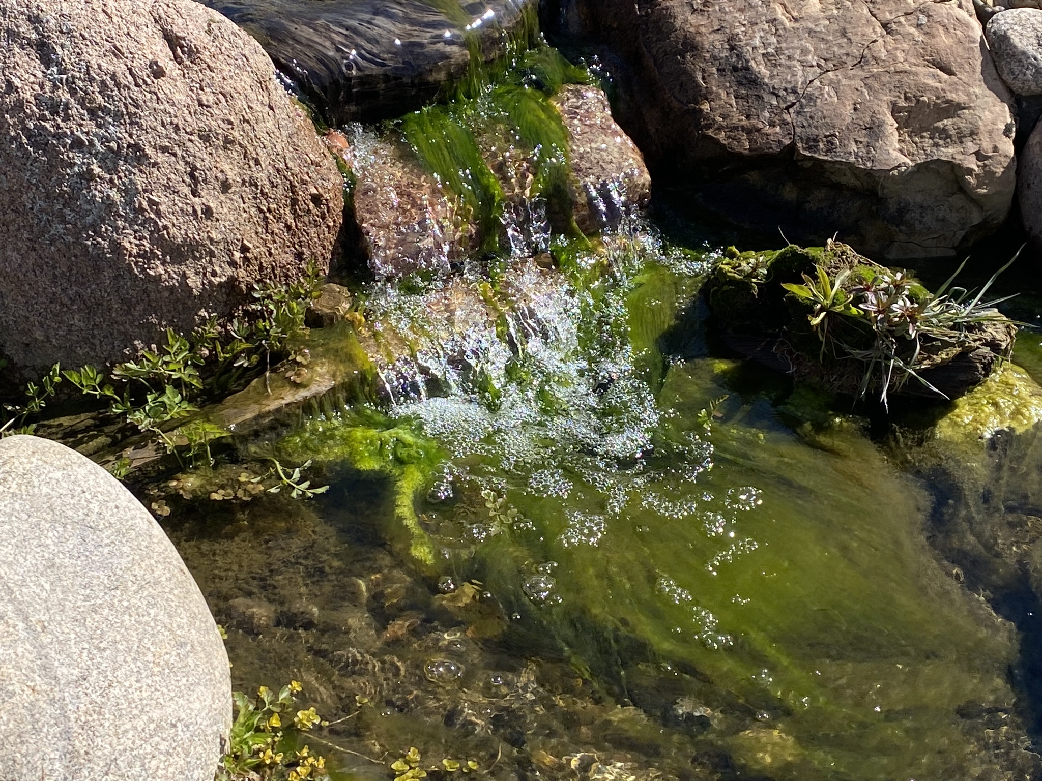 It is hard to show this in a photo. I’ll have to take another picture when I run into it again. It covers all the rocks, looks like peanut butter slime and may have bubbles in it. Can be in the pond or waterfall (or both!)
